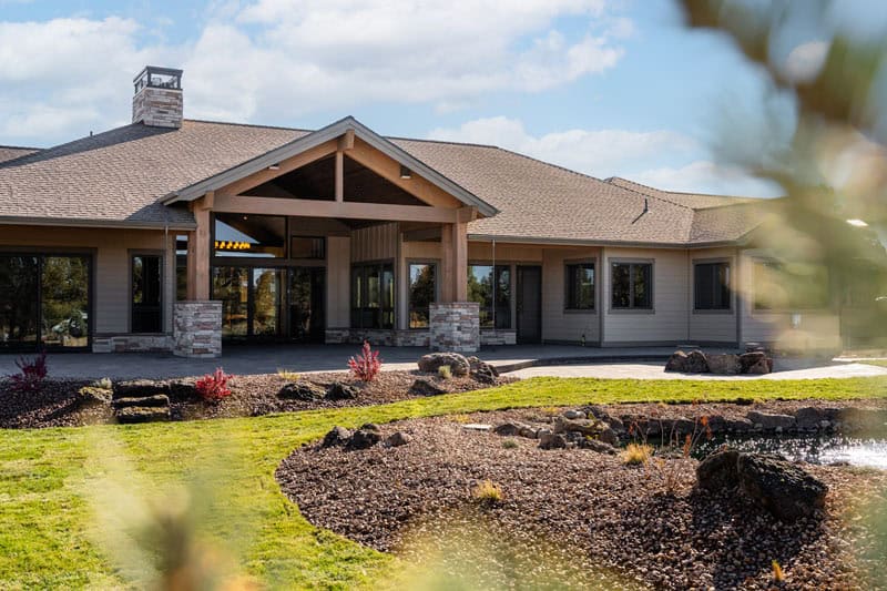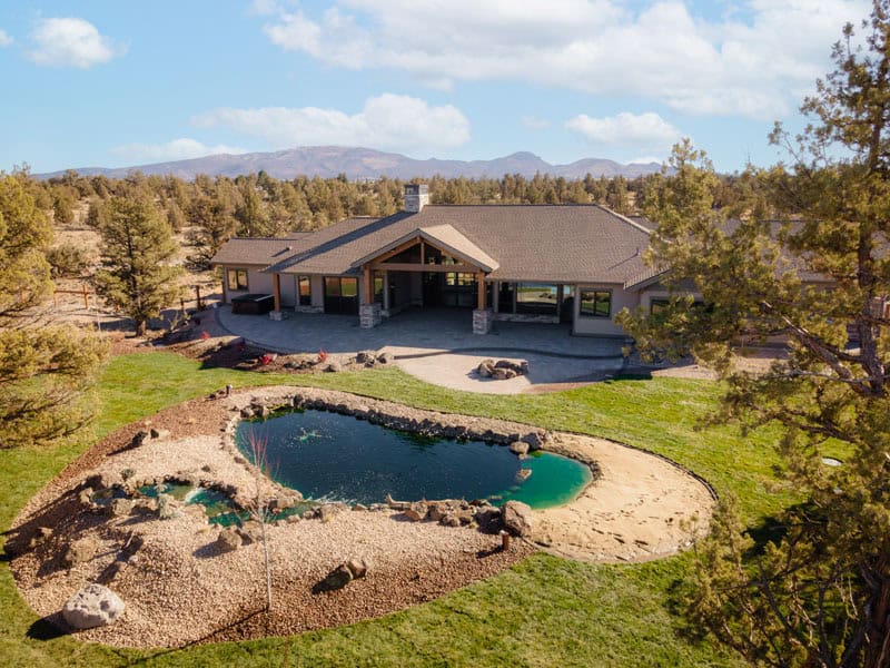 The home’s exterior is painted in warm, natural tones that complement the landscape and create a welcoming presence. The expansive backyard features a stunning koi pond, providing a serene and inviting space for relaxation and enjoyment.