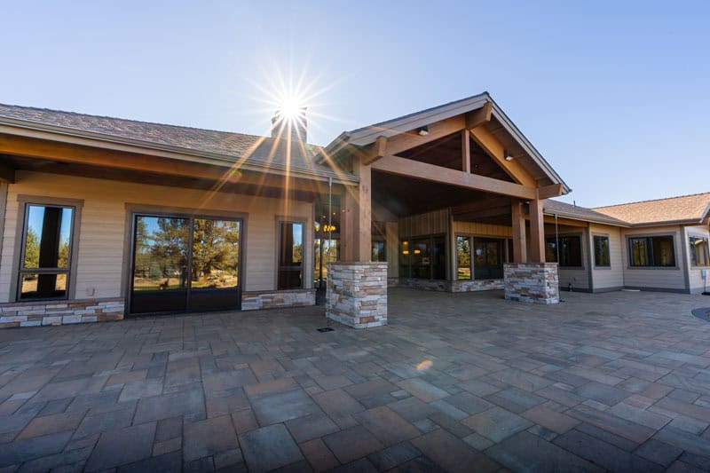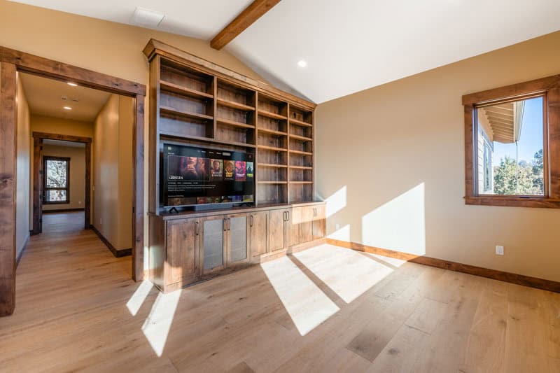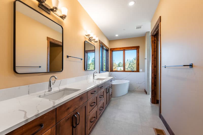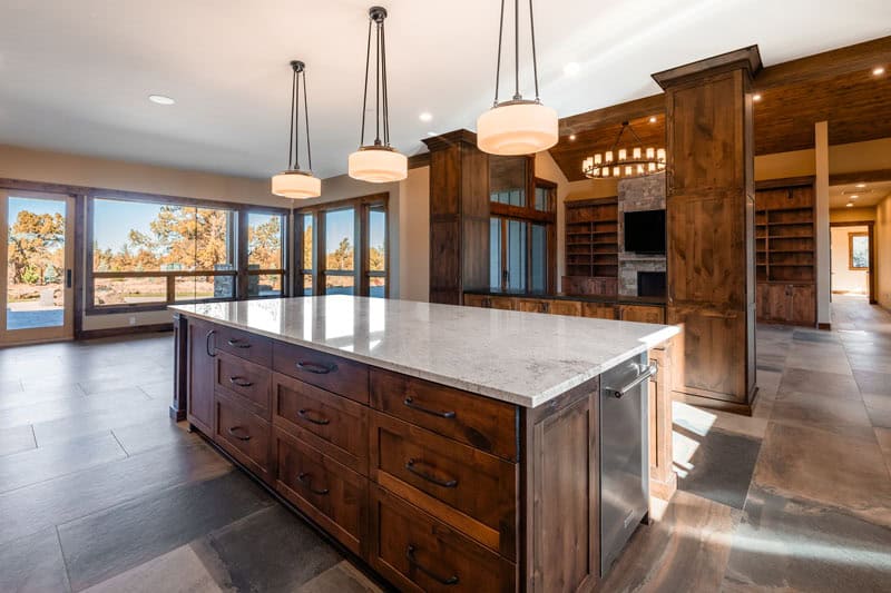 The interior features a spacious living room flooded with natural light, seamlessly connecting areas with a mix of tile and wood flooring. The large kitchen serves as the heart of the home, while curbless showers provide a modern, open feel to the bathrooms.
